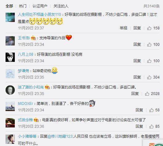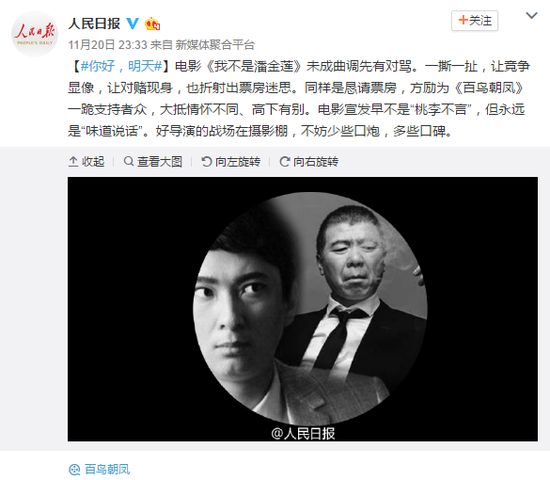 11月20日晚间,人民日报发布官方微博公开批评电影《我不是潘金莲》未成曲调先有对骂,并直呼:好导演的战场在摄影棚,不妨少些口炮,多些口碑,文章配图则选用了王思聪和冯小刚