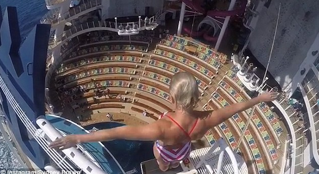 据英国《每日邮报》报道,Cesilie Carlton是一名高空跳水表演者,她演出地点是在一艘邮轮上,这艘游轮拥有世界游轮上最深的泳池。