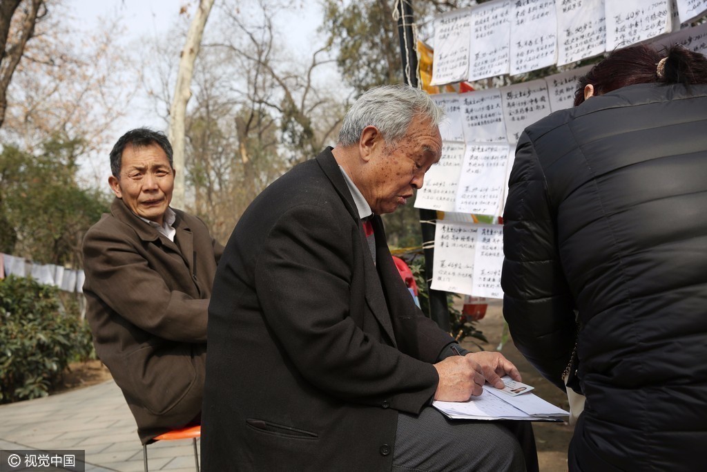 西安市革命公园露天相亲角,阅读征婚信息的老年人。在这里登记和遴选“心仪对象”的大多是老年人。
