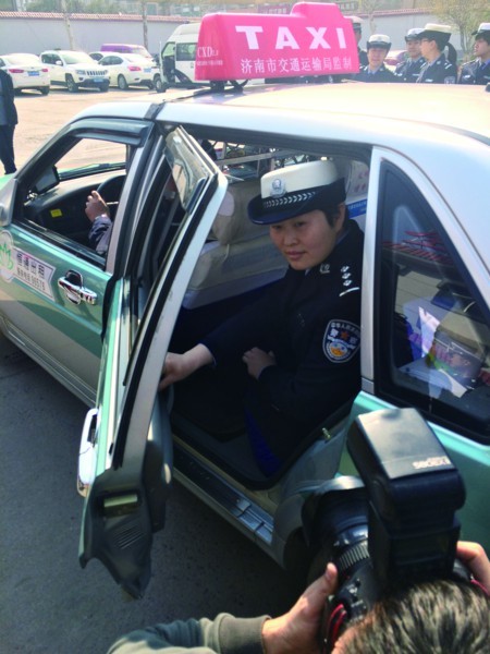 交警在出租车后车门张贴提醒标语 记者张舒摄