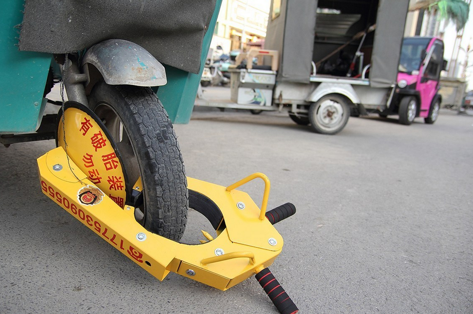 2017年5月9日,山东菏泽,当地交警部门对三轮、四轮电动轿车乱停乱放问题开展整治行动,市区道路上乱停放的找不到车主的,阻塞交通的三轮、四轮电轿车就地上锁,此锁自带爆胎装置,如车主带锁强制起步,该锁具便会自动爆胎。