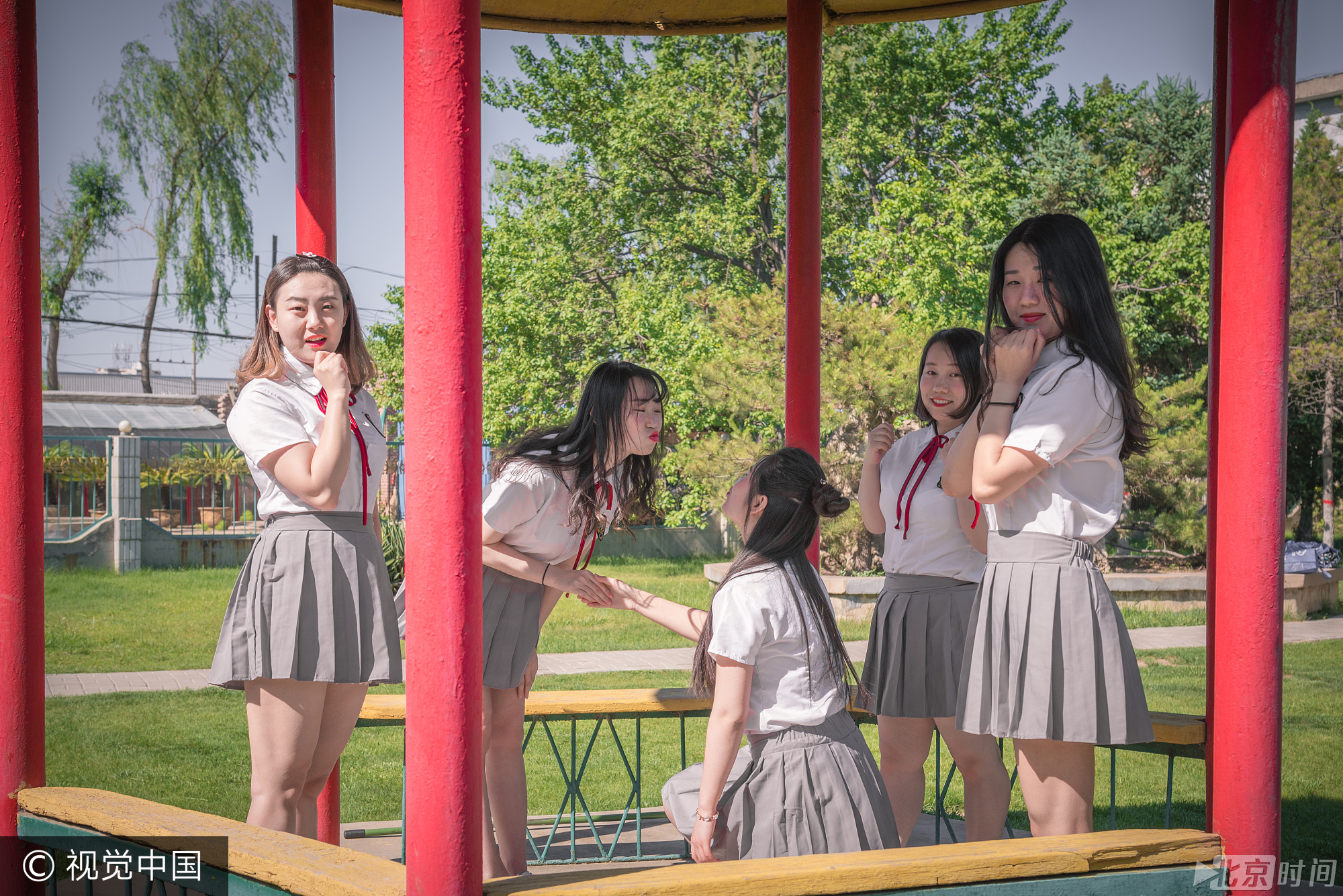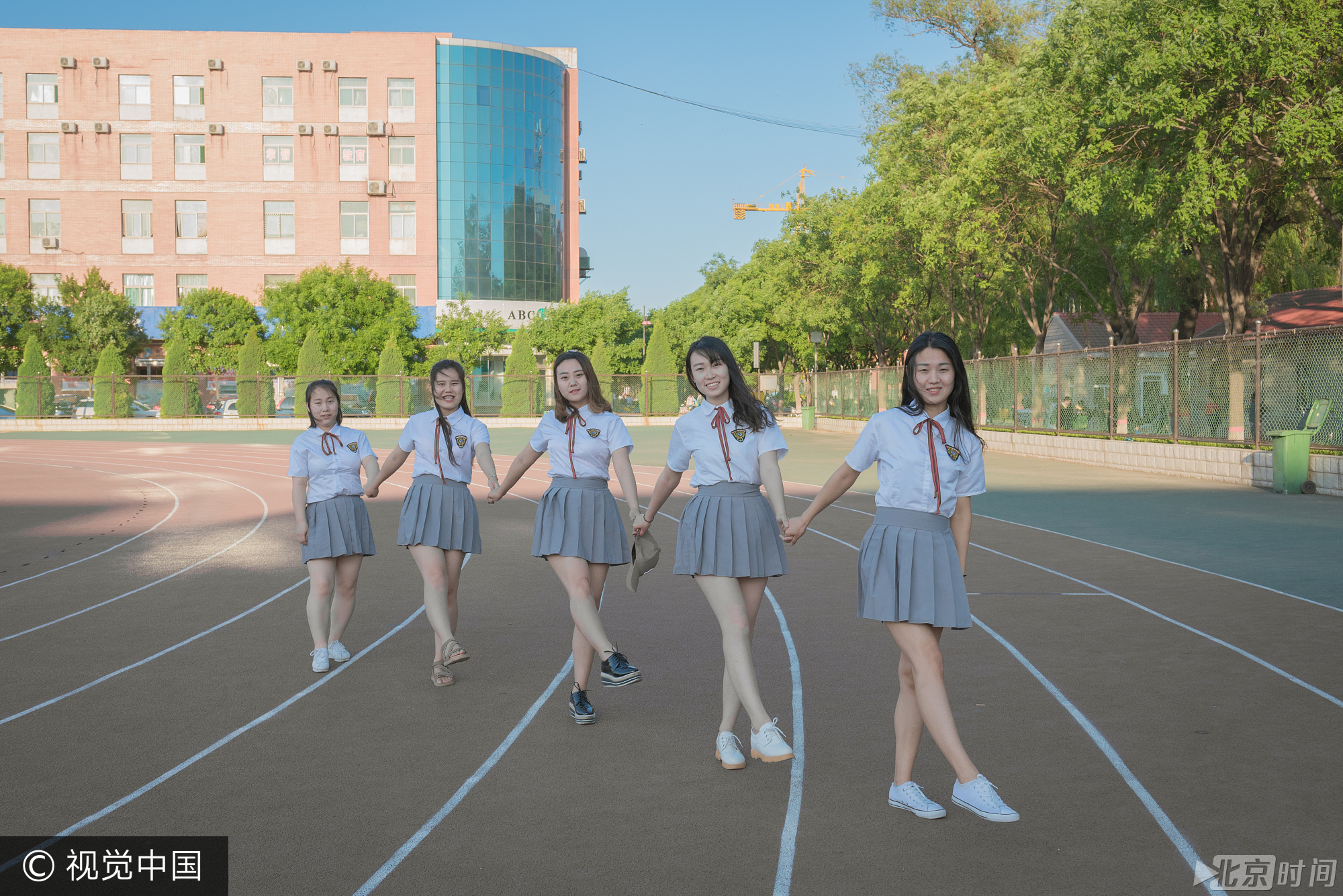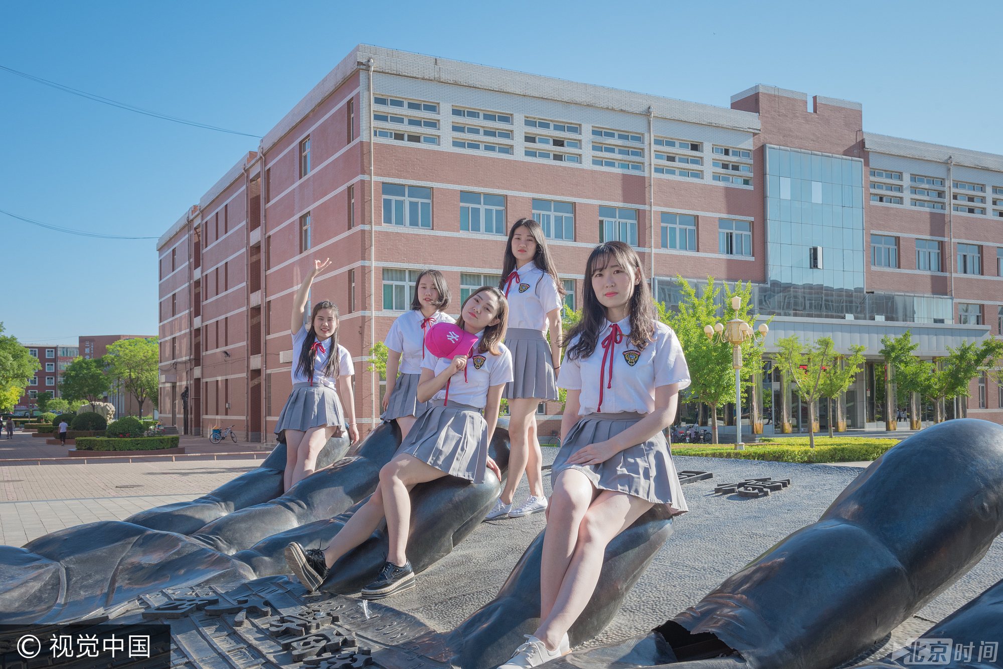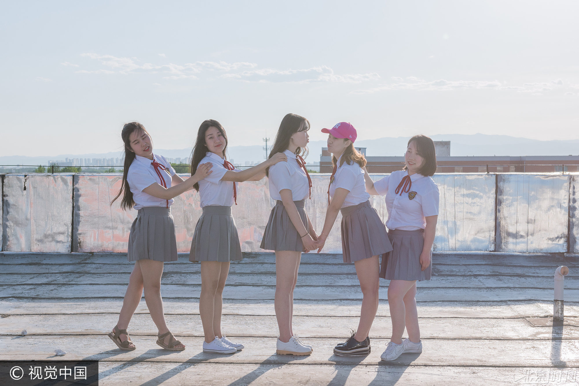 2017年5月23日,太原市,一高校同宿舍5位青春靓丽的毕业生姐妹花身穿清纯校服,在校园里各个值得留恋的角落里拍摄创意毕业照,以此纪念大学四年友谊和逝去的青春。