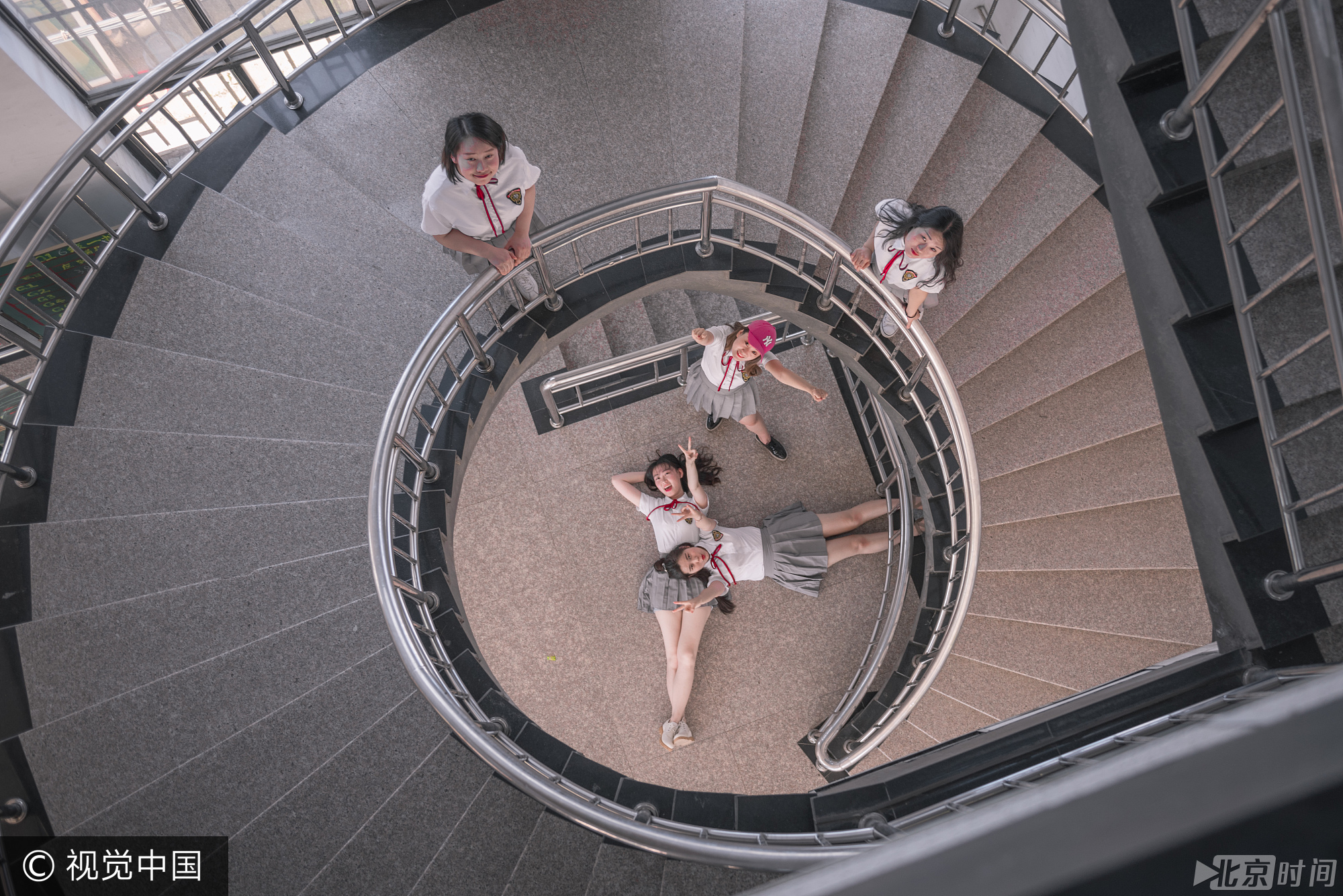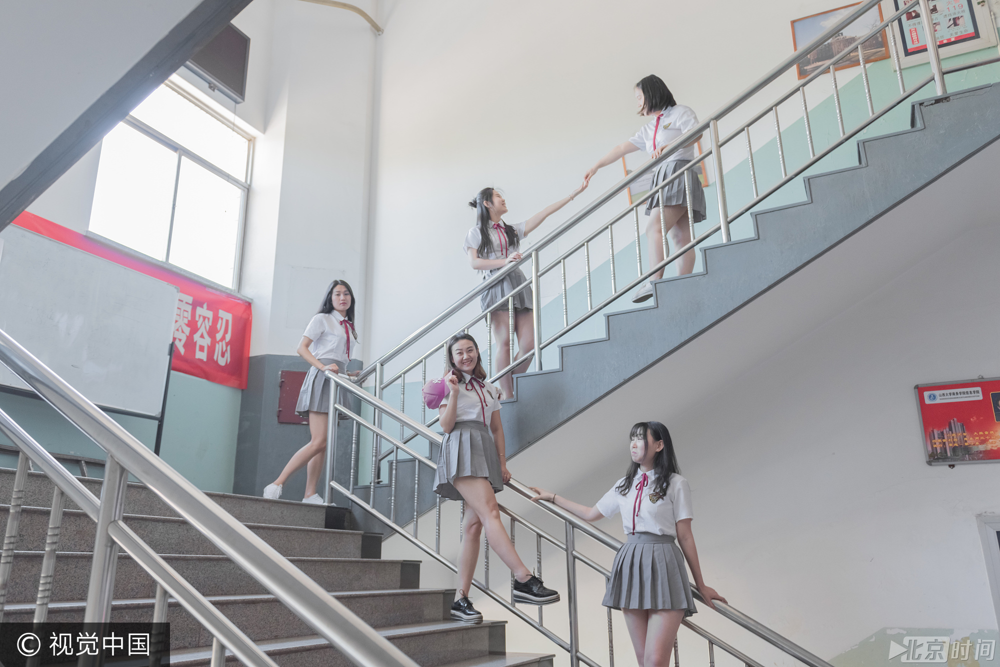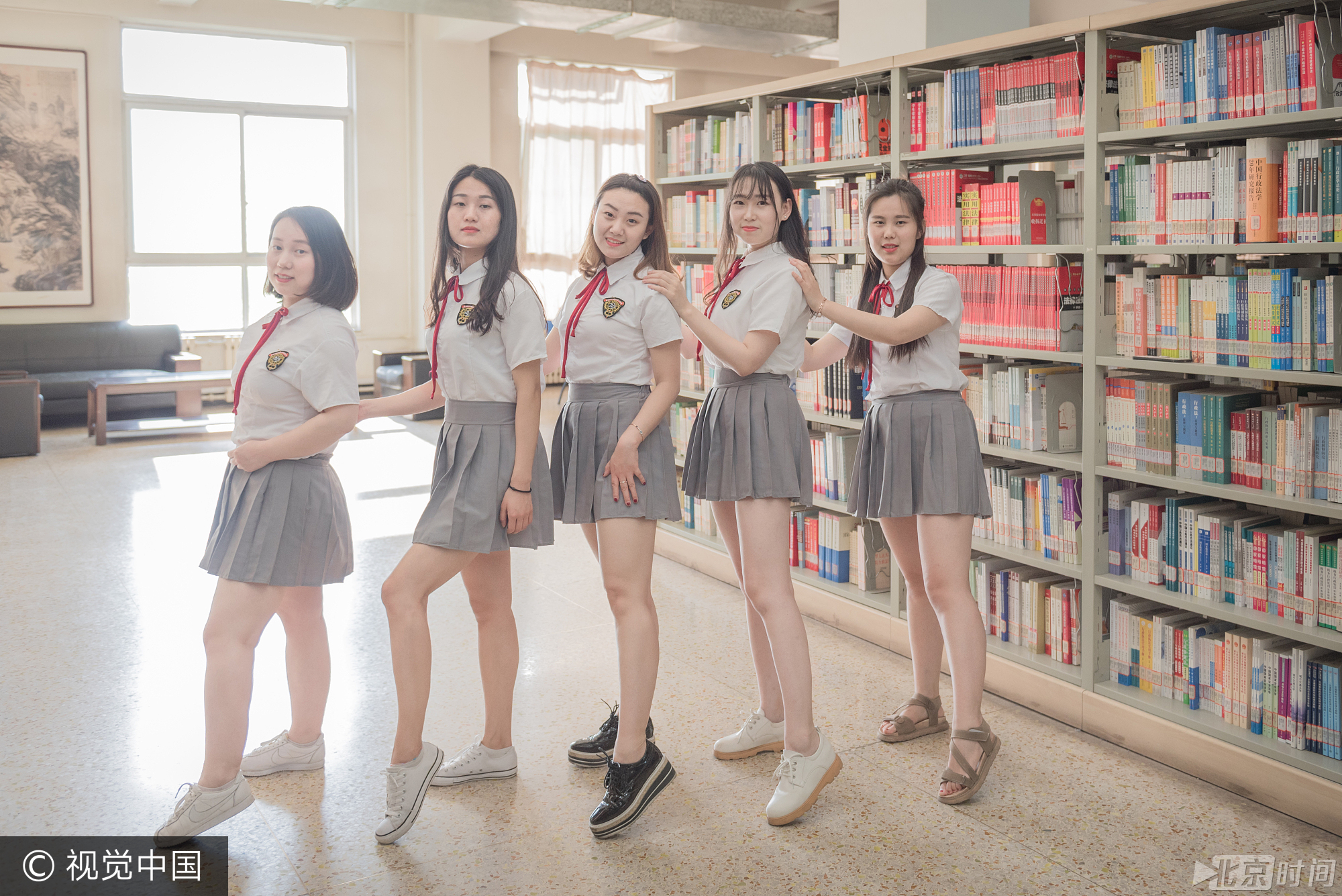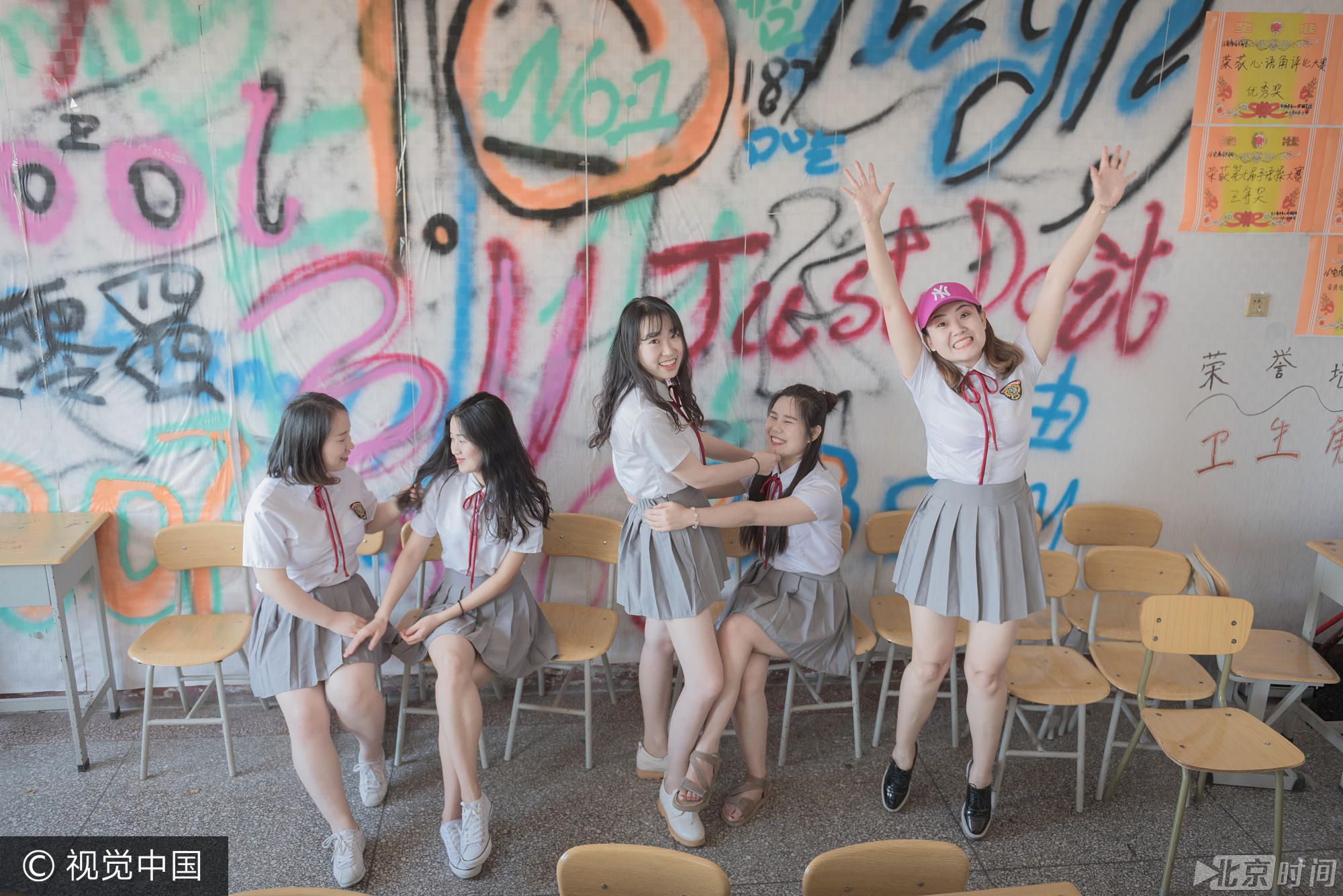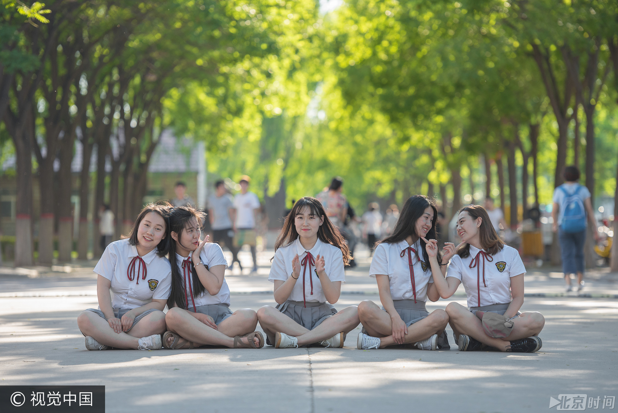 2017年5月23日,太原市,一高校同宿舍5位青春靓丽的毕业生姐妹花身穿清纯校服,在校园里各个值得留恋的角落里拍摄创意毕业照,以此纪念大学四年友谊和逝去的青春。