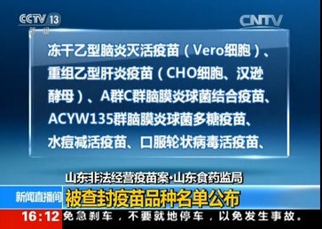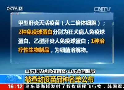 山东省食药监局2016年3月21日公布,经对警方提供的查封疫苗品种清单进行核实,共涉及疫苗12种、免疫球蛋白2种、治疗性生物制品1种。